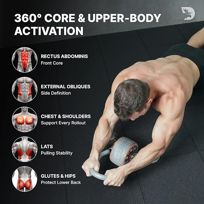 The DMoose Ab Roller is not only for abs—it helps strengthen several muscle groups including abdominal muscles, shoulders, arms, chest, and back. Regular use can help improve core strength, posture, balance, and overall body stability.